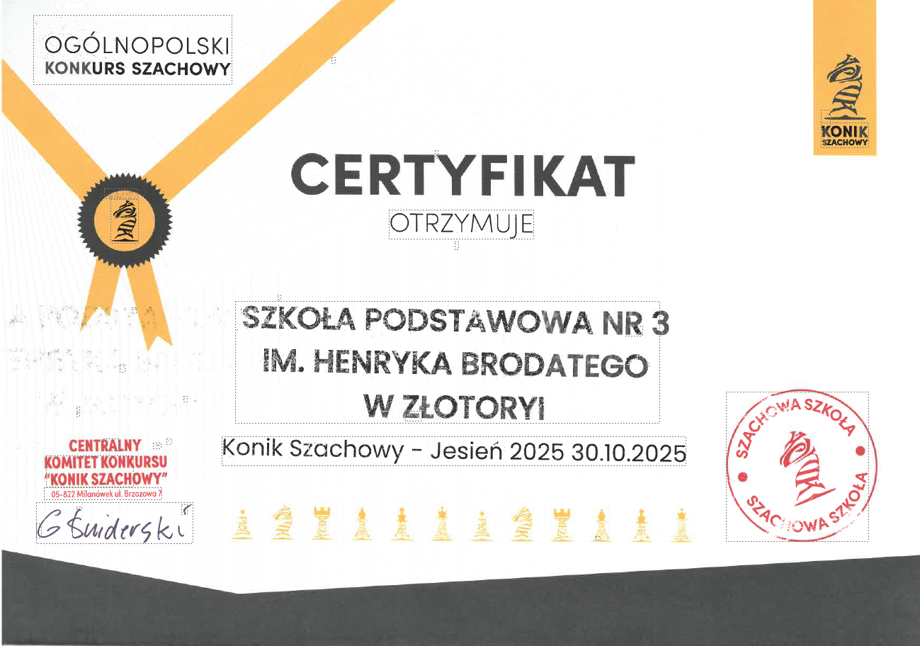 30 października 2025r. 17 uczniów z naszej szkoły przystąpiło Ogólnopolskiego Konkursu rozwiązywania zadań szachowych „Konik szachowy”. Konkurs polegał na rozwiązaniu 30 zadań szachowych - w tym samym czasie w szkołach w 5 krajach Europy (Polski, Niemiec, Francji, Hiszpanii i Włoch). Na rozwiązanie zadań uczestnicy mieli 60 min.