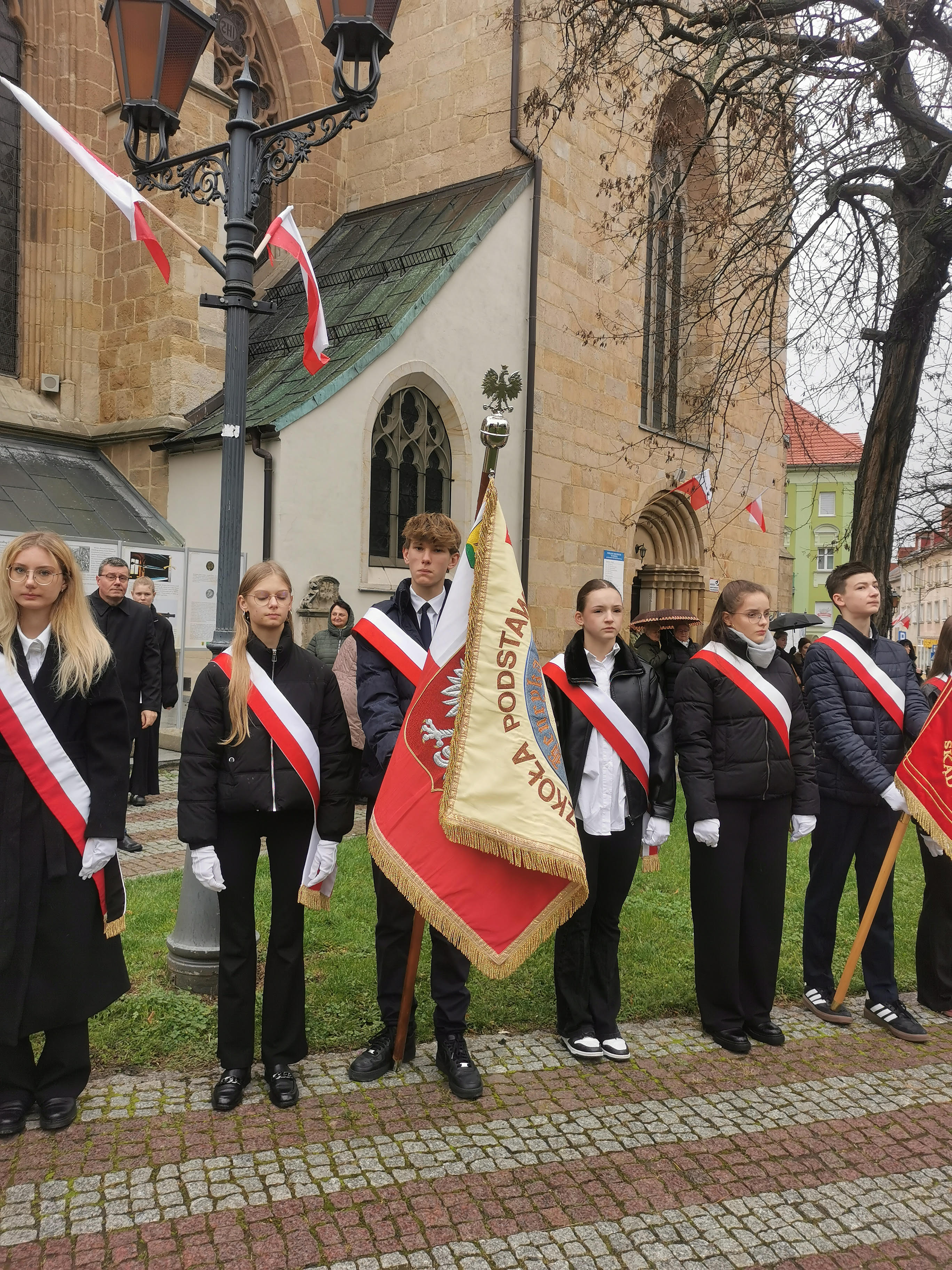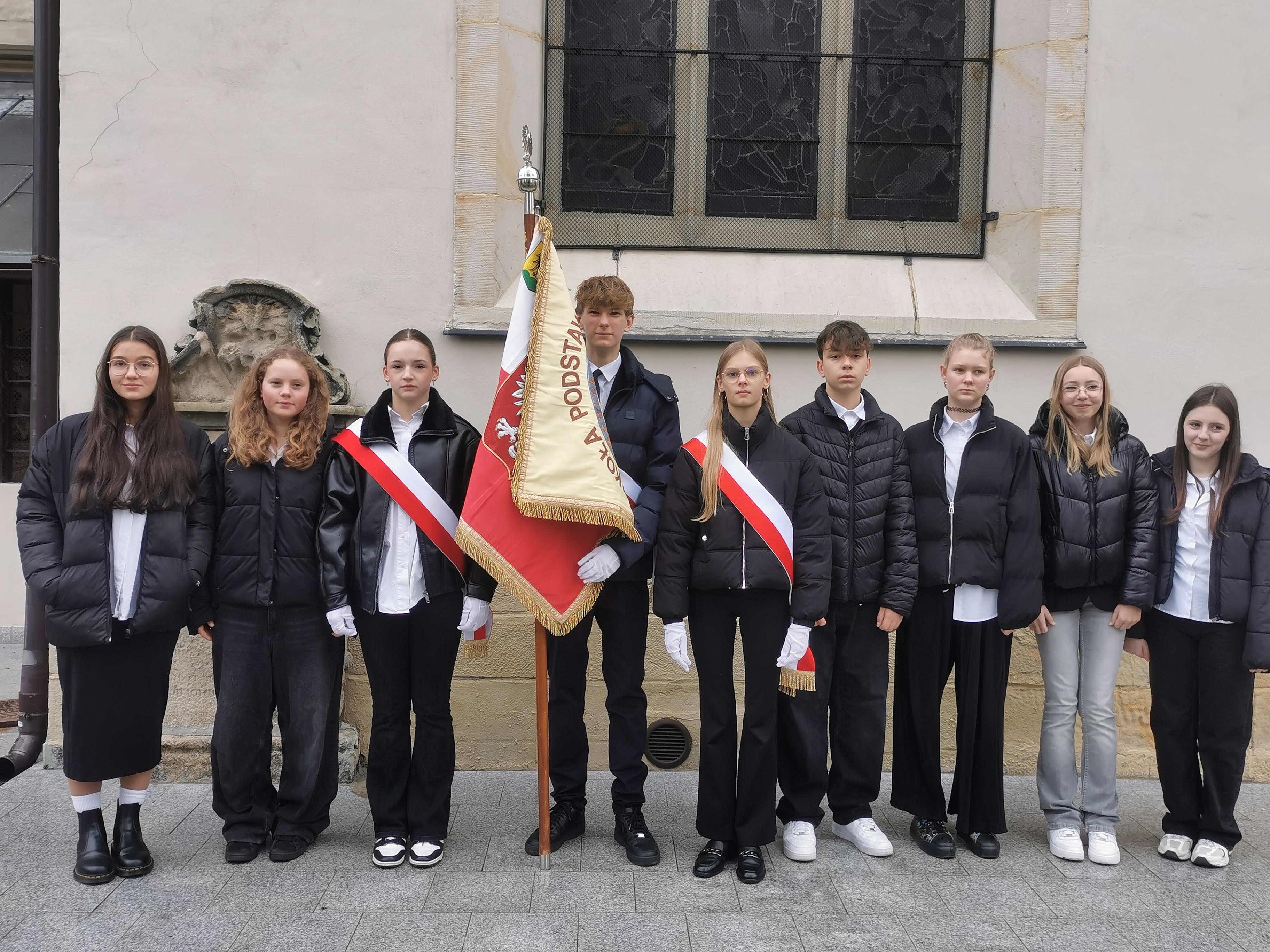 W uroczystościach uczestniczył również poczet sztandarowy szkoły, który z dumą reprezentował naszą społeczność szkolną podczas obchodów.