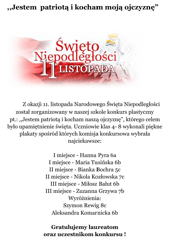W czwartek i piątek uczniowie naszej szkoły zmierzyli się z quizem dotyczącym Święta Niepodległości. Na terenie szkoły zamieszczone były pytania, na które należało odpowiedzieć na kartach odpowiedzi. Nagrodami były słodkie niespodzianki.